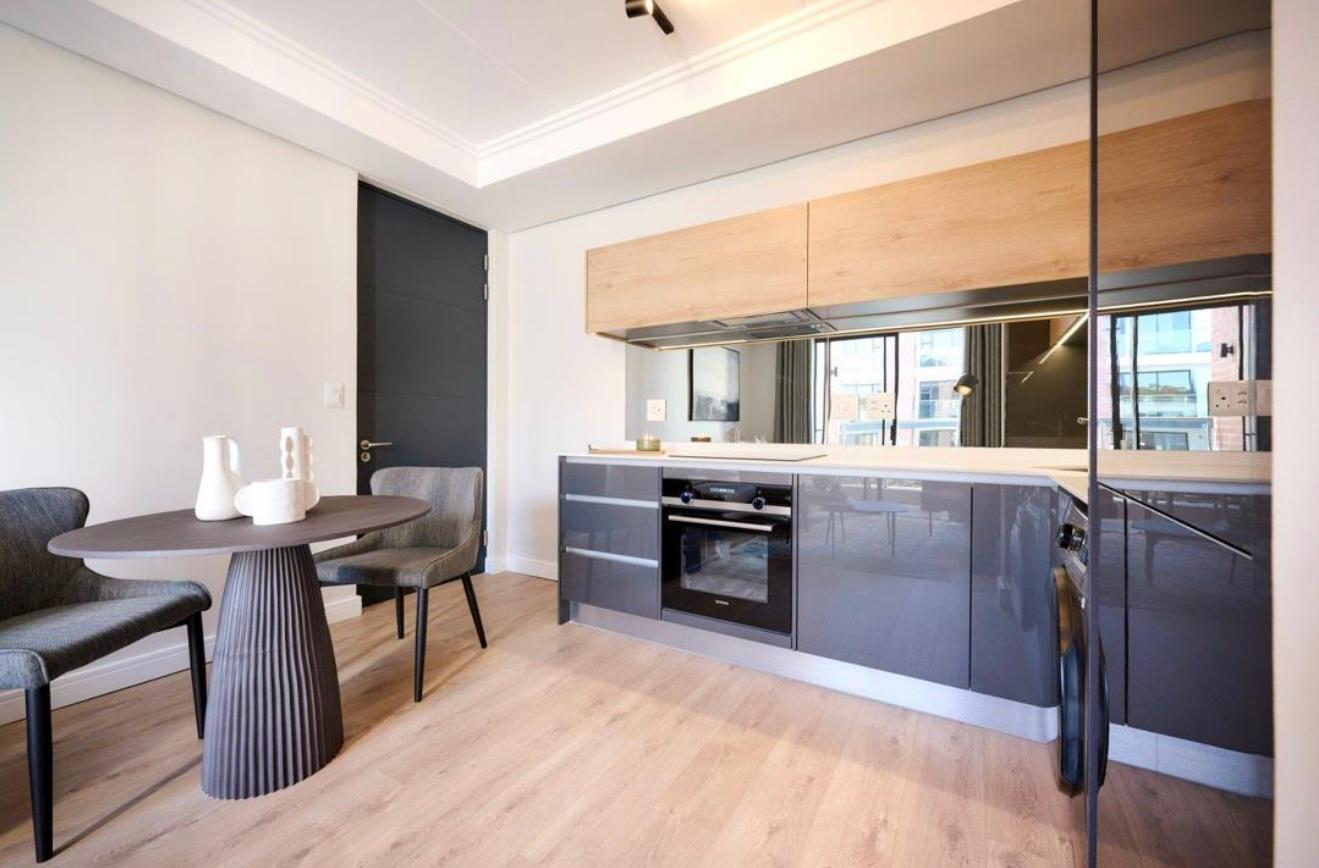 This 60.5 sqm apartment features top-quality finishes, an open-plan kitchen with integrated appliances (including a washing machine and fridge/freezer), and a spacious en-suite bedroom with a balcony accessible from the living room.